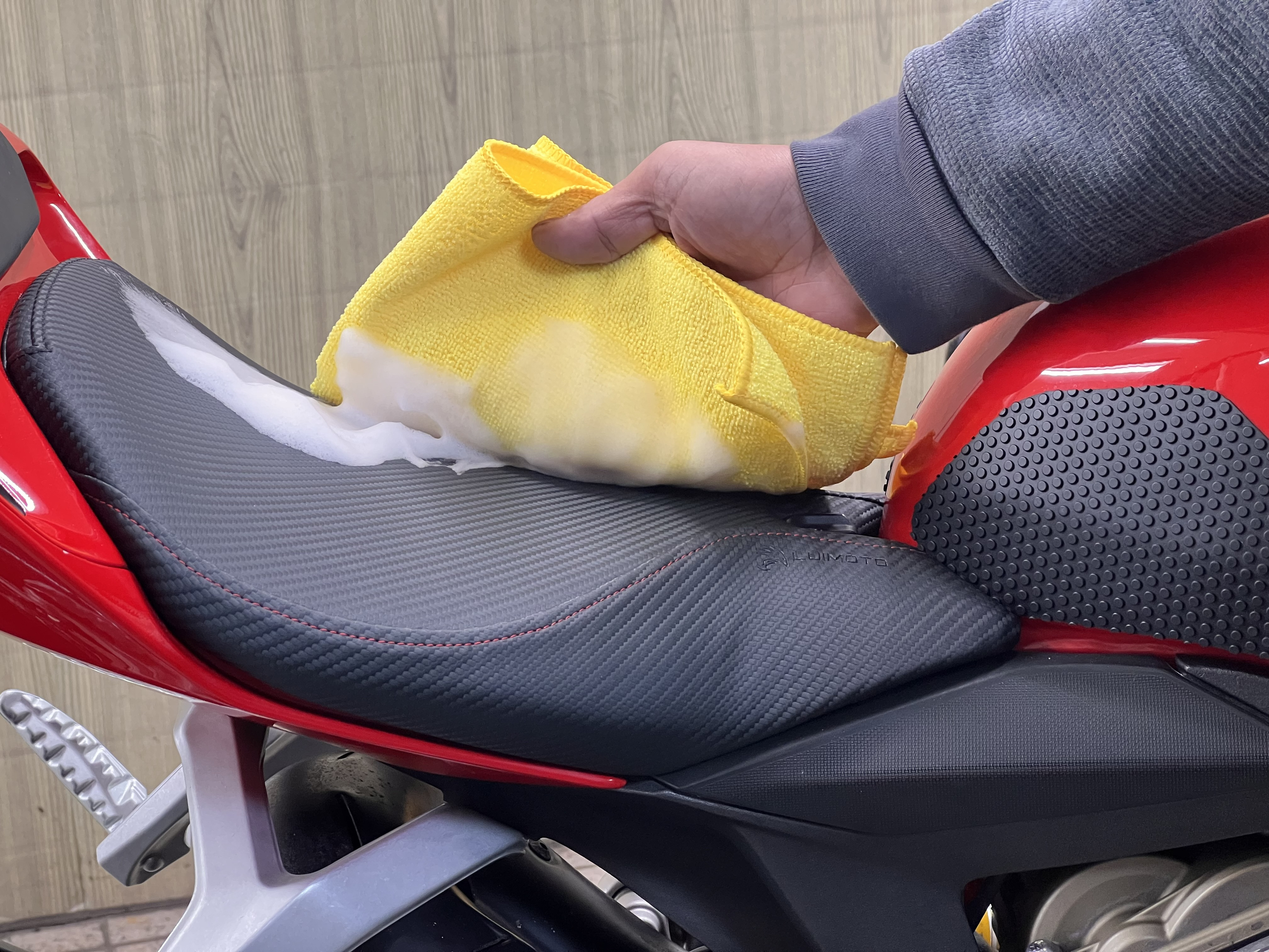 艶やしっとり感を出しながらもノンシリコン剤なので滑りにくく走行時の安定性向上に役立ちます、また保護剤の効果でシート表皮を長持ちさせる働きがあります!